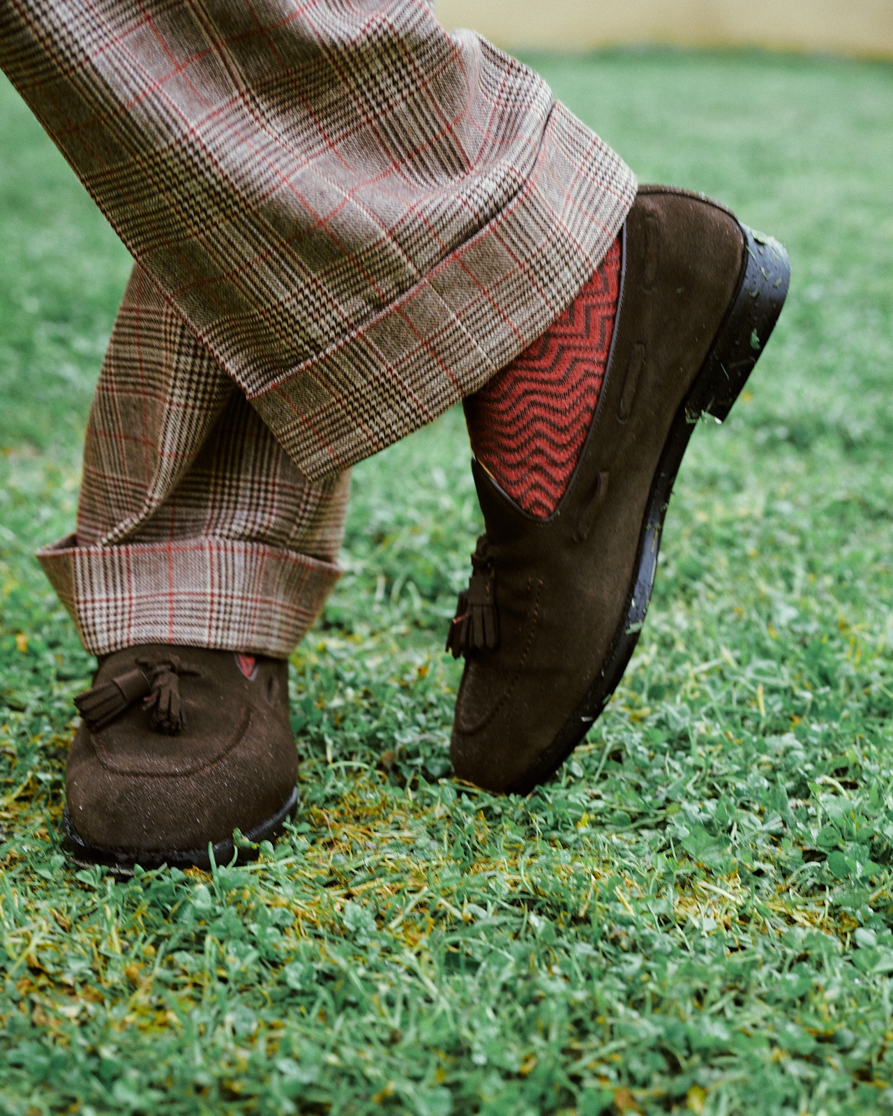 Abito doppiopetto verde bosco con camicia azzurra / Pelle e tweed bicolore Brown and green loafers Hockerty | ||