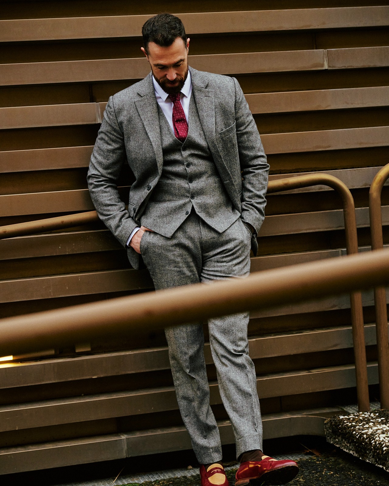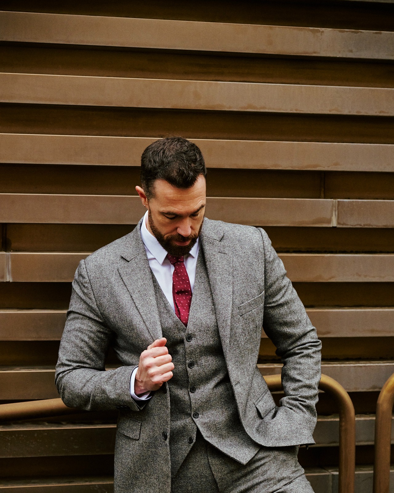Uno stile perfettoQuesto look combina un abito tre pezzi in tweed a spina di pesce grigio su misura realizzato in un tessuto misto lana grigio, che aggiunge texture e un’aria classica ma moderna, ideale per eventi autunnali e invernali, con mocassini che completano l’outfit con un tocco elegante e rilassato allo stesso tempo. Il gilet, la giacca e i pantaloni coordinati creano una silhouette sofisticata e senza tempo, perfetta per chi cerca uno stile raffinato, comfort e personalità. Crediti immagine: jonathan.blasco | ||