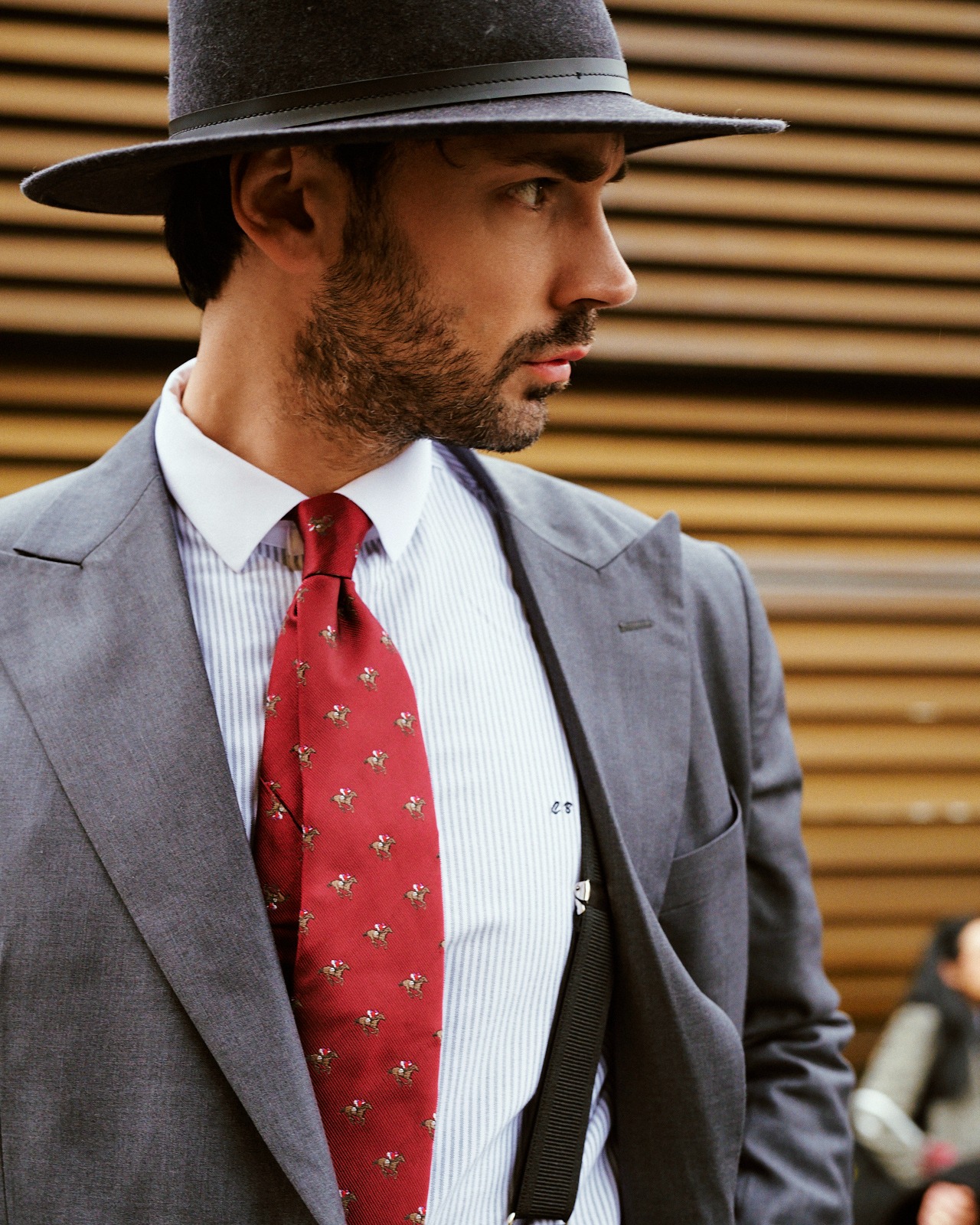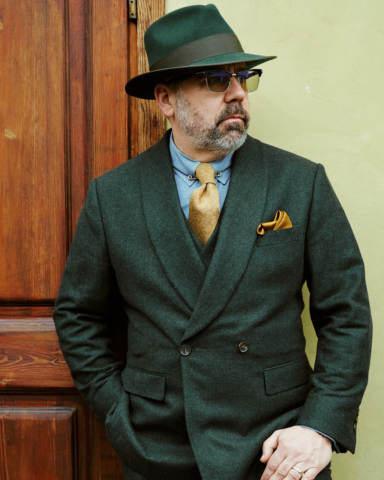 | A sophisticated combination with distinctive character. The forest green double-breasted suit adds presence and visual depth, while the light blue shirt introduces freshness and balanced contrast. An elegant look, confident and with its own personality. Image credits @suittielinksbracesman | ||