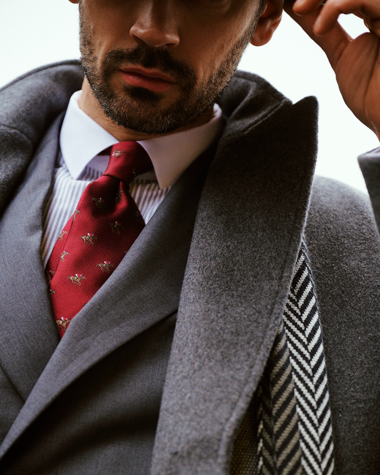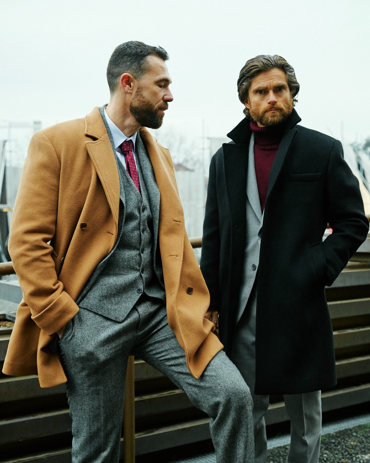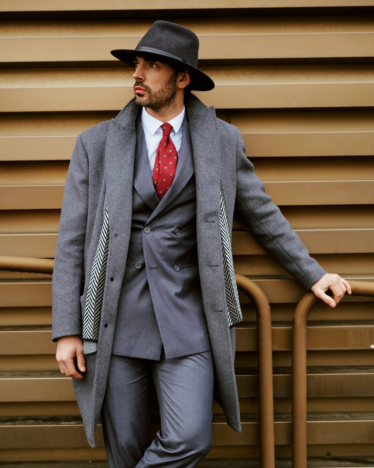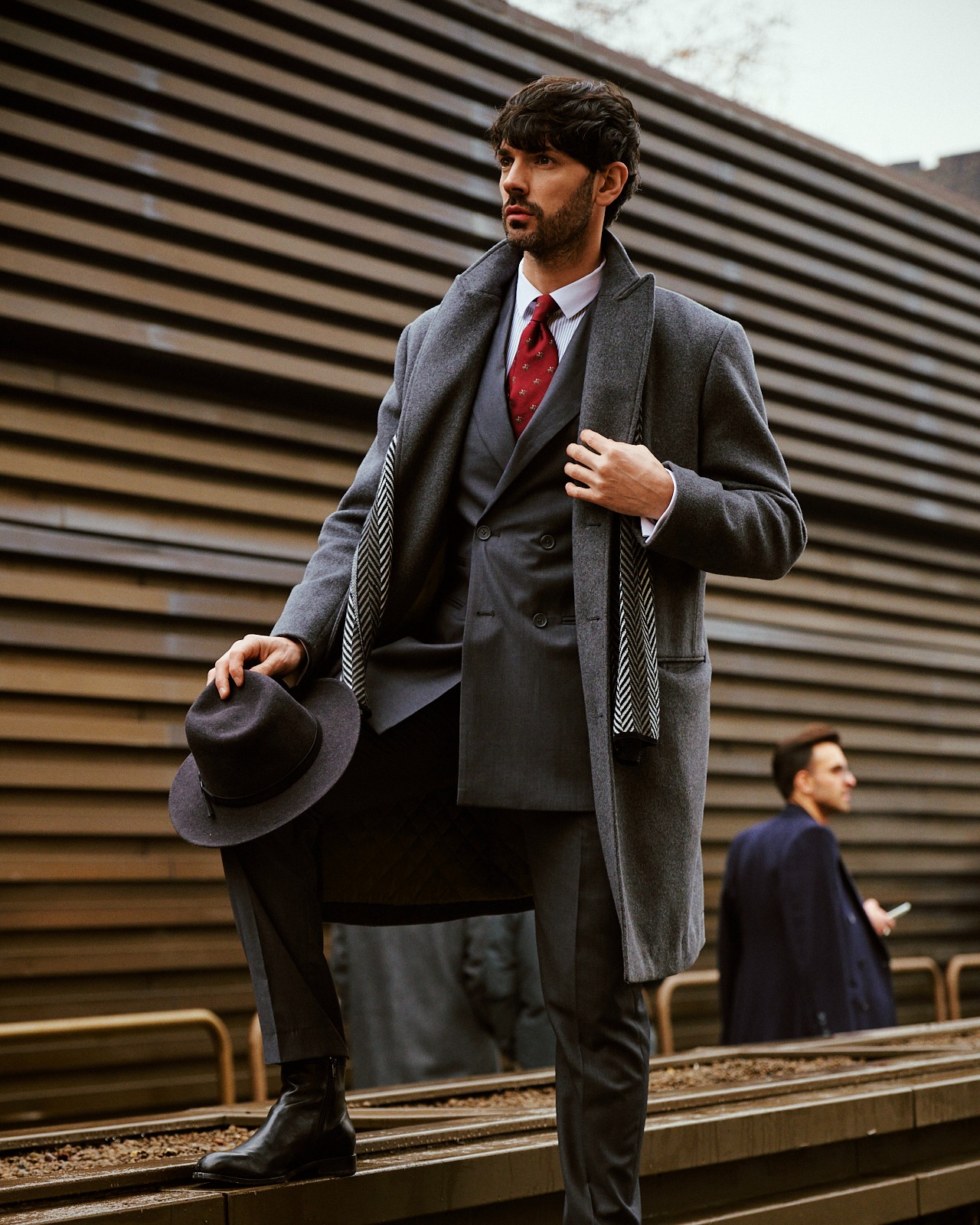 Cappotto di lana grigio, abito grigio a tre pezzi | ||