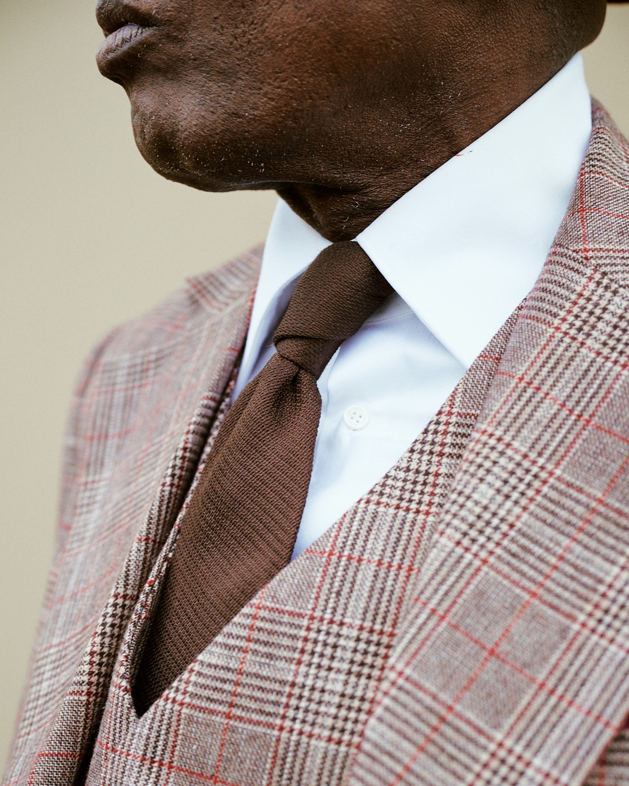 | Una proposta classica con carattere sartoriale. Il motivo a scacchi aggiunge dinamismo visivo, mentre il completo a tre pezzi rafforza la struttura e l’eleganza. La cravatta marrone mantiene l’armonia dei colori per un look raffinato e coerente. Crediti @thierrymouelelasprezzatura | ||